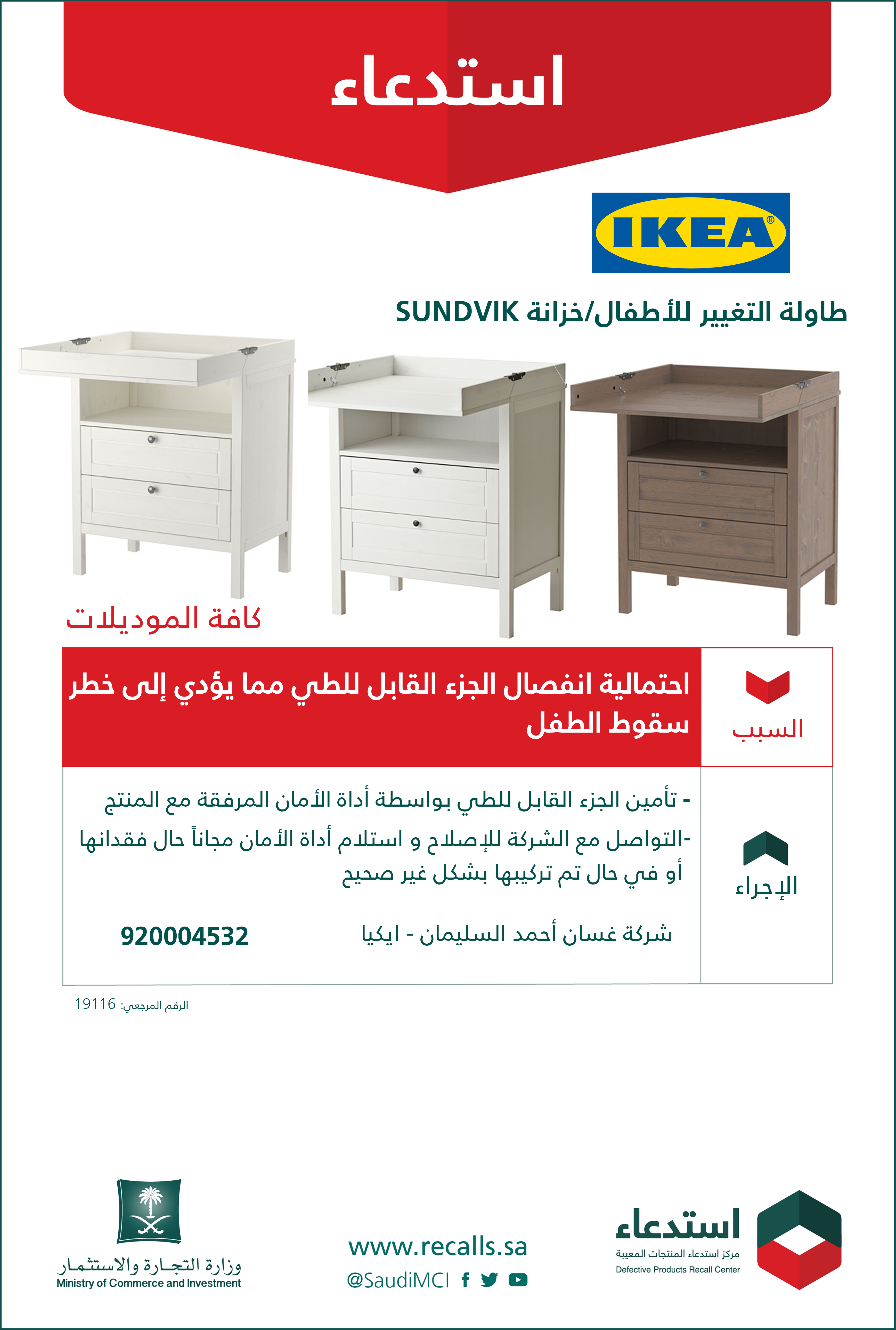 وزارة التجارة مركز استدعاء المنتجات المعيبة استدعاء ايكيا طاولة التغيير للأطفال خزانة sundvik السبب احتمالية انفصال الجزء القابل للطي مما يؤدي إلى خطر سقوط الطفل